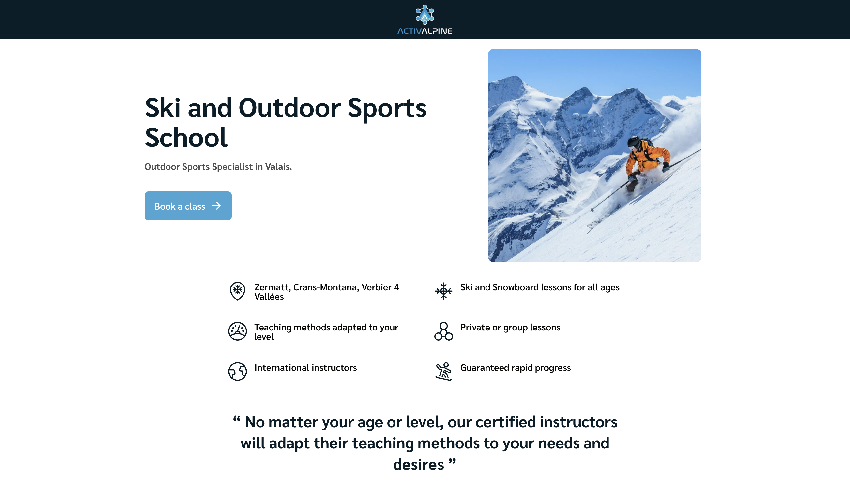 ActivAlpine est une école de ski basée en Valais, spécialisée dans les sports outdoor. Elle propose des cours de ski, de snowboard et de randonnée adaptés à tous les niveaux, avec l’accompagnement de moniteurs certifiés.