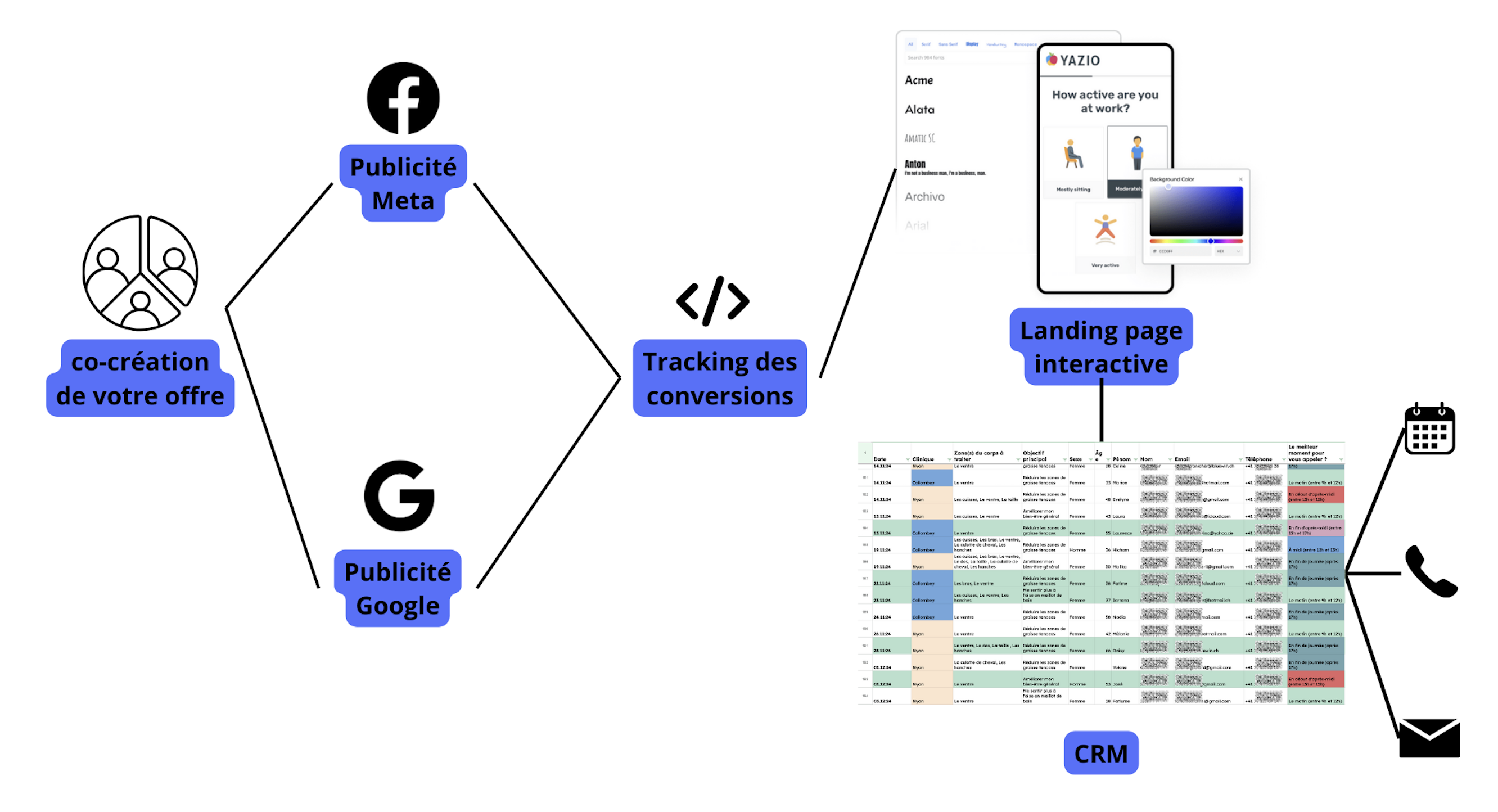 Concrètement, c’est un processus qui combine plusieurs techniques et outils : la mise en place de campagnes sur des plateformes comme Google et Meta, la création de landing pages optimisées pour la conversion, le suivi des performances à l’aide de solutions de tracking et la liaison avec le CRM.